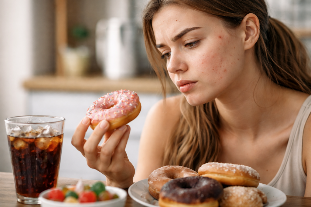 High intake of refined sugars can affect inflammation and may trigger acne in some people, especially those with acne-prone skin. This doesn’t mean you can never enjoy sweets, but patterns matter more than one day.